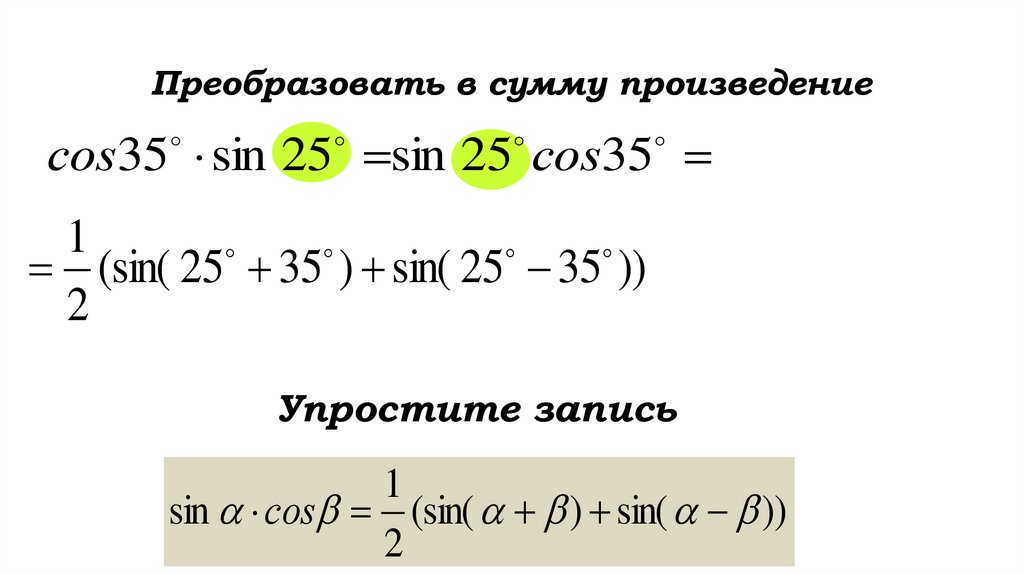 Преобразовать в сумму произведениесоs35 sin 25 ...