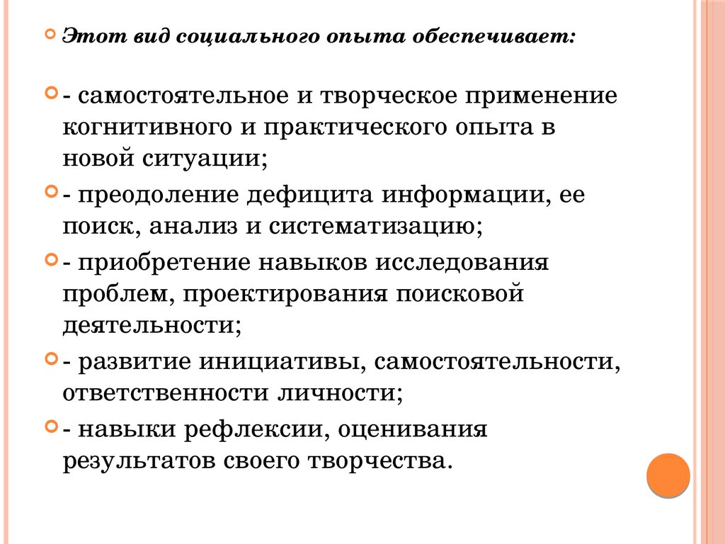 Этот вид социального опыта обеспечивает: самостоятельное и творческое применение