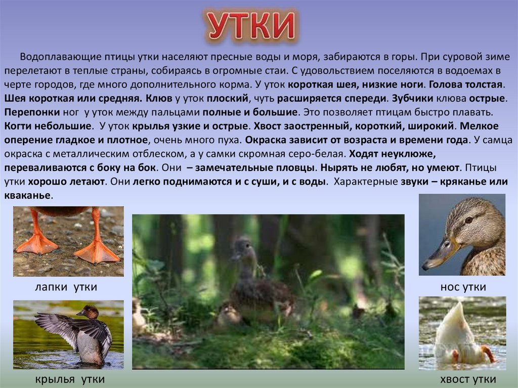 Водоплавающие птицы утки населяют пресные воды и моря, забираются в горы. При суровой зимеперелетают в теплые страны, собираясь в огромные стаи. С удовольствием поселяются в водоемах в