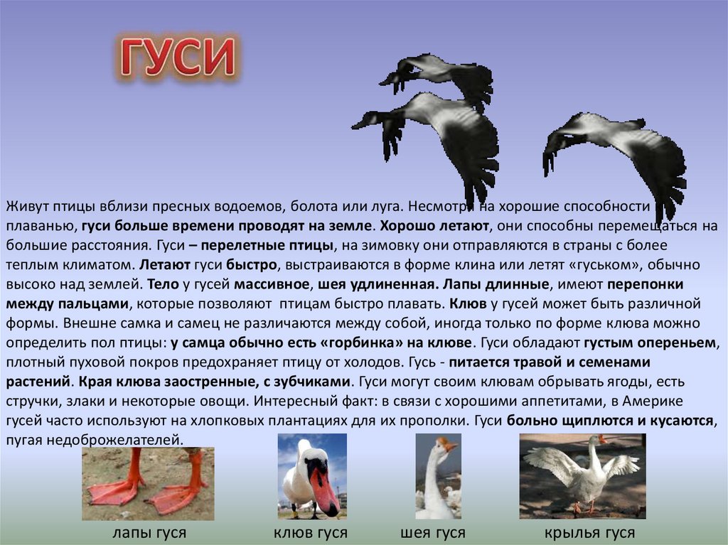 теплым климатом. Летают гуси быстро, выстраиваются в форме клина или летят «гуськом», обычно