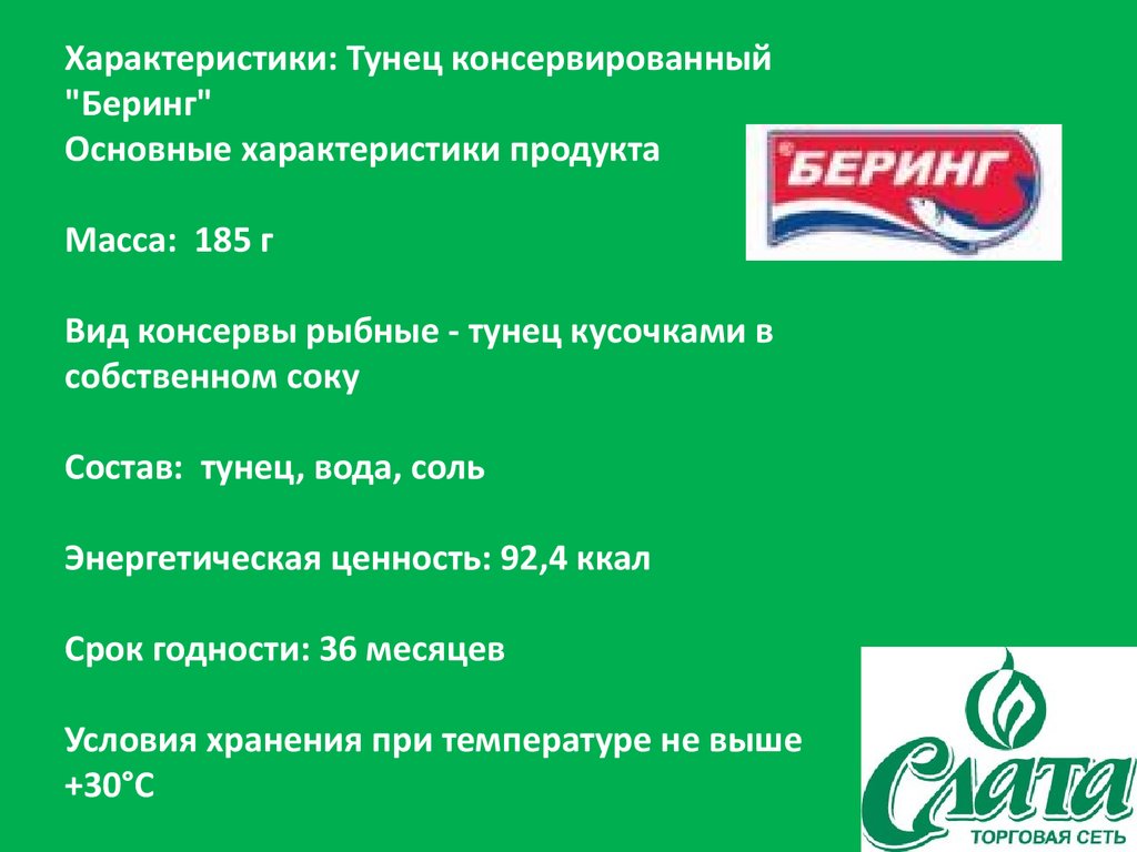 Характеристики: Тунец консервированный"Беринг"
