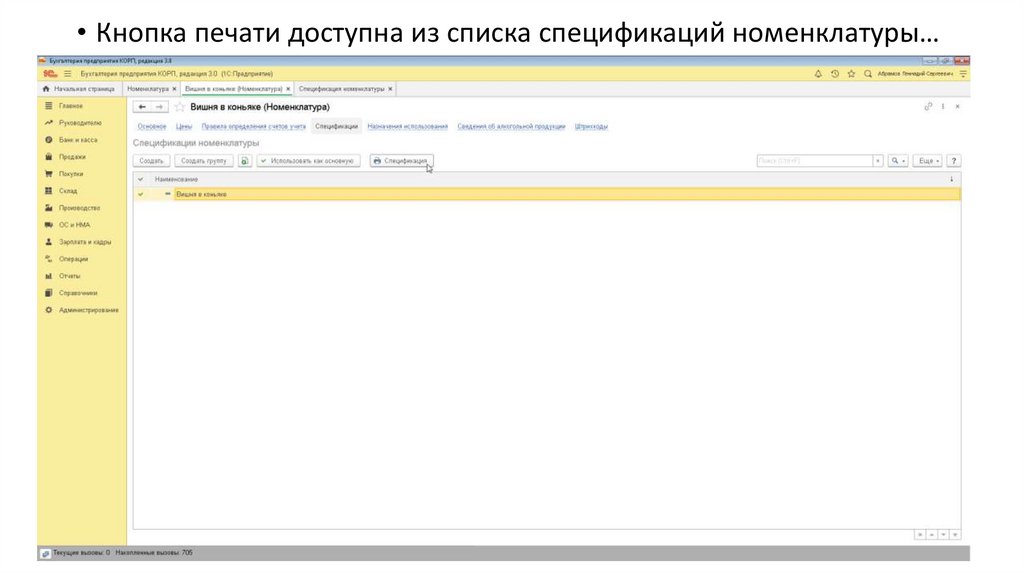 • Кнопка печати доступна из списка спецификаций номенклатуры…
