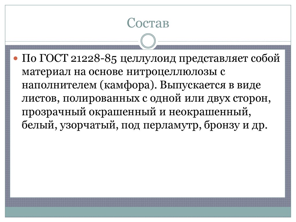 СоставПо ГОСТ 21228-85 целлулоид представляет собой