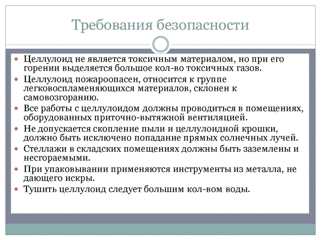 Требования безопасностиЦеллулоид не является токсичным материалом, но при его