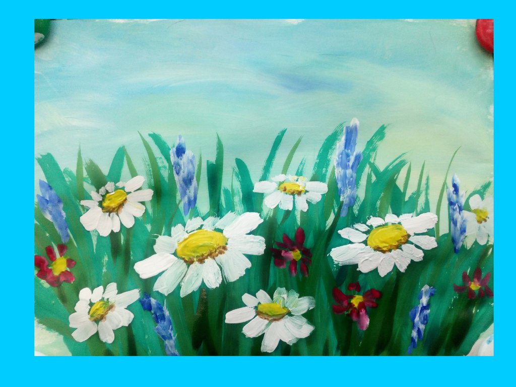 Пишем лепестки ромашек густой белойкраской. Боковые длинные, нижние
