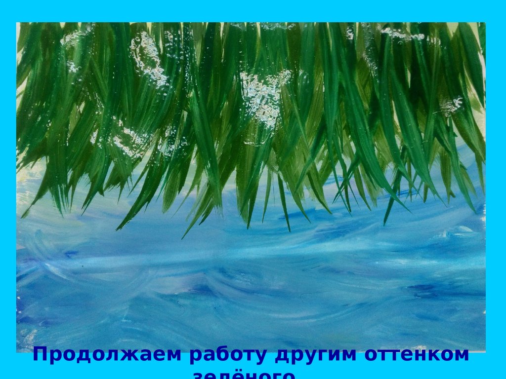 Сверху зелёной краской пишем траву.Травинки растут в разном