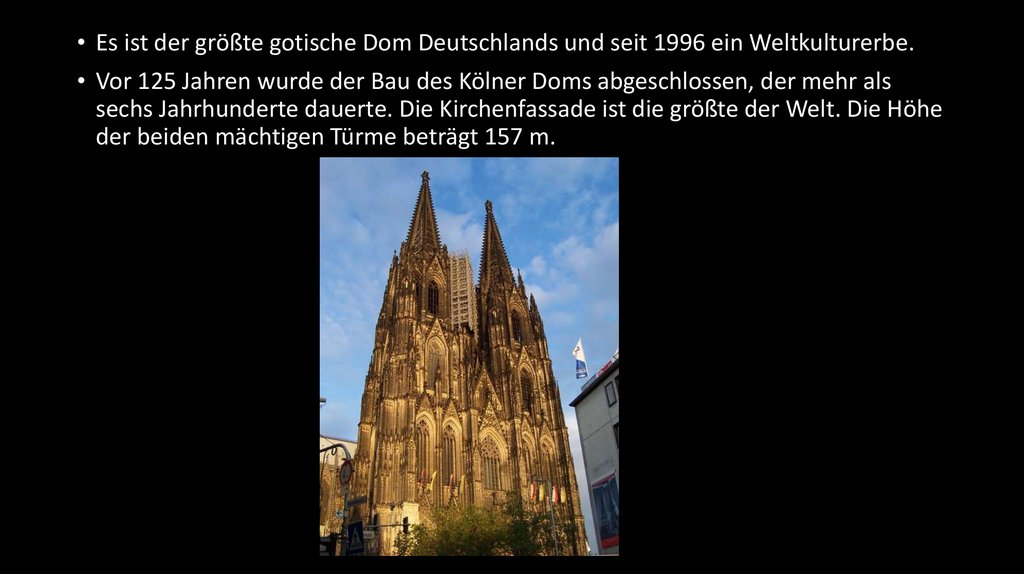 • Es ist der größte gotische Dom Deutschlands und seit 1996 ein Weltkulturerbe.• Vor 125 Jahren wurde der Bau des Kölner Doms abgeschlossen, der mehr als