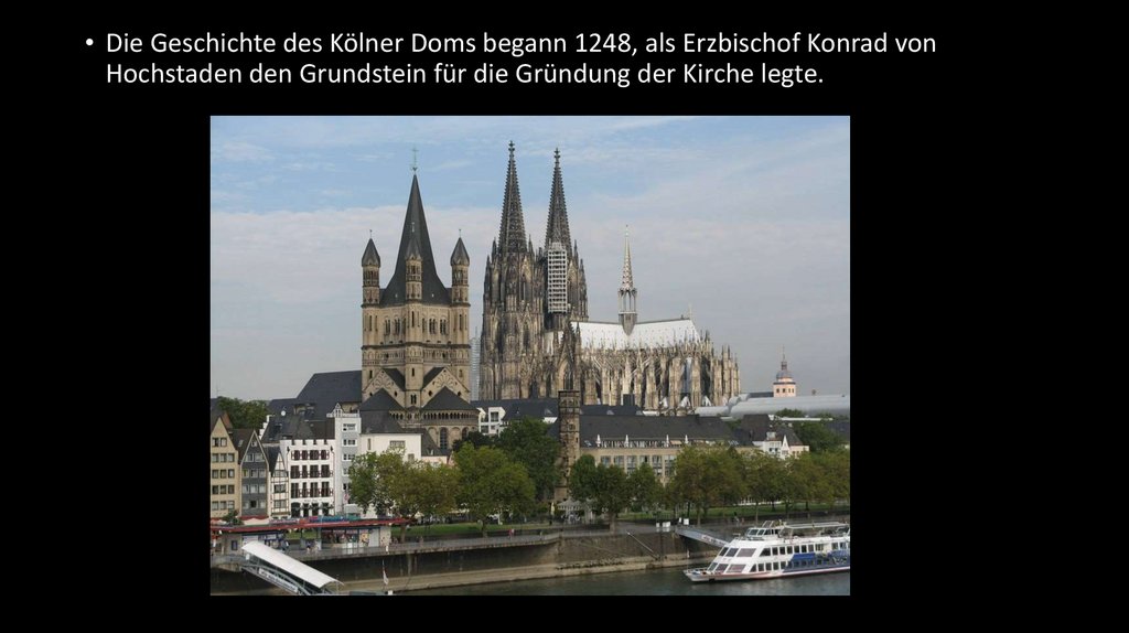 • Die Geschichte des Kölner Doms begann 1248, als Erzbischof Konrad vonHochstaden den Grundstein für die Gründung der Kirche legte.