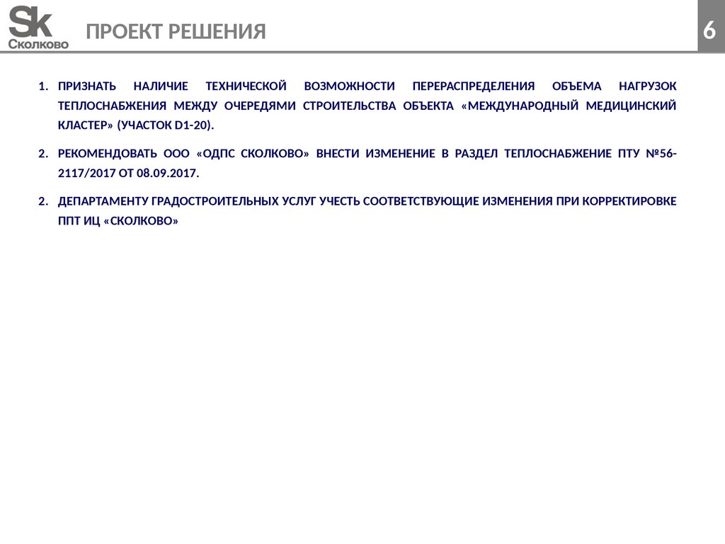 2. РЕКОМЕНДОВАТЬ ООО «ОДПС СКОЛКОВО» ВНЕСТИ ИЗМЕНЕНИЕ В РАЗДЕЛ ТЕПЛОСНАБЖЕНИЕ ПТУ №562117/2017 ОТ 08.09.2017.