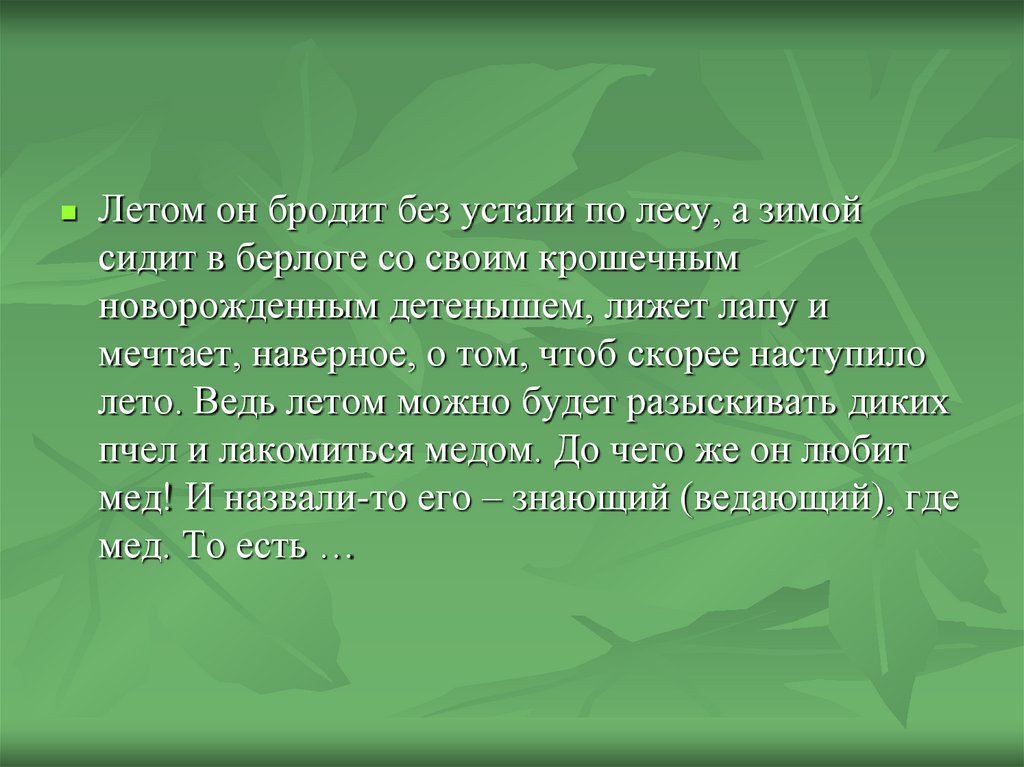 Летом он бродит без устали по лесу, а зимойсидит в берлоге со своим крошечным