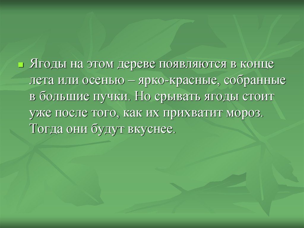 Ягоды на этом дереве появляются в концелета или осенью – ярко-красные, собранные