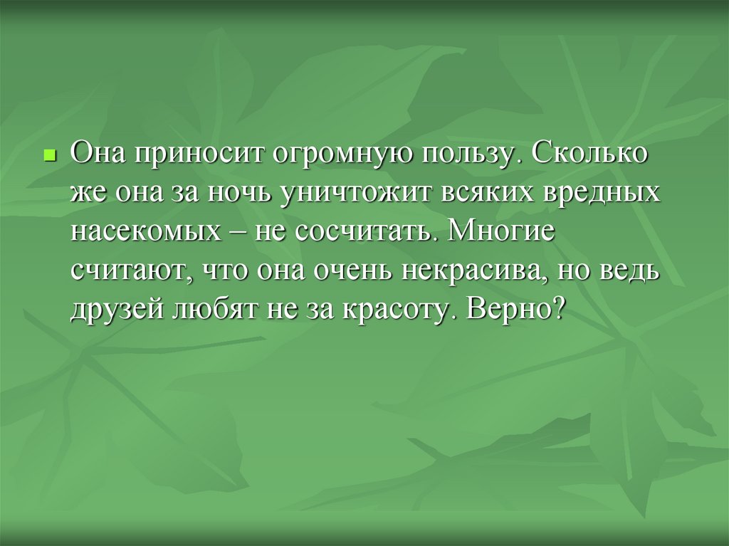 Она приносит огромную пользу. Сколькоже она за ночь уничтожит всяких вредных