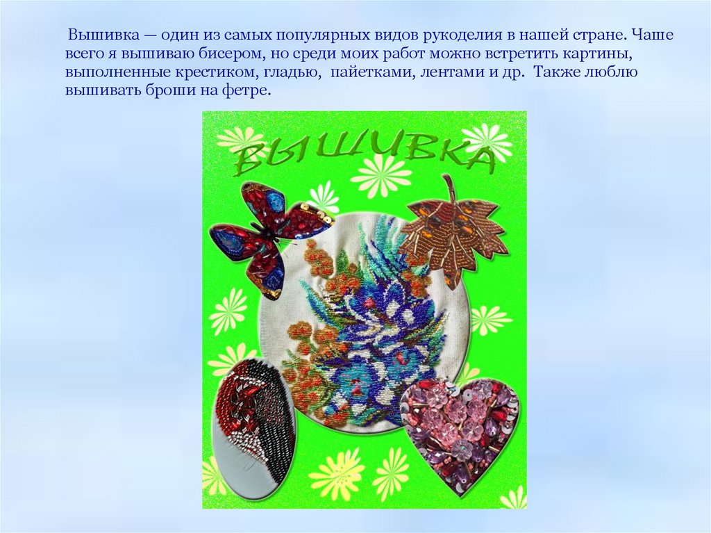 выполненные крестиком, гладью, пайетками, лентами и др. Также люблю