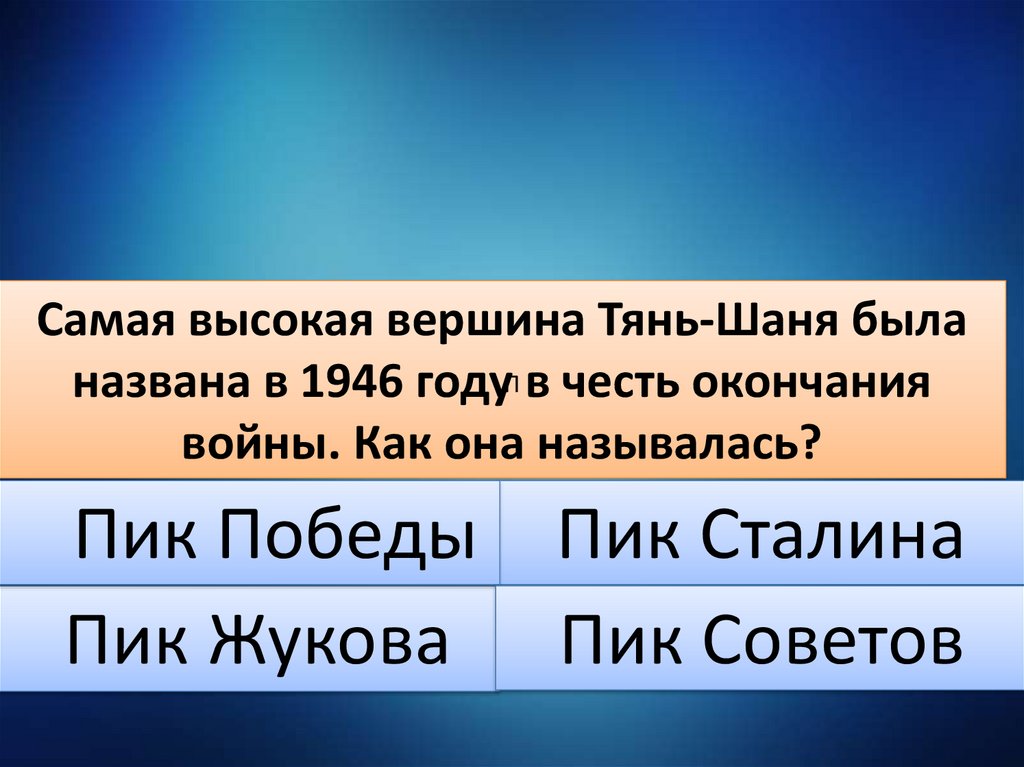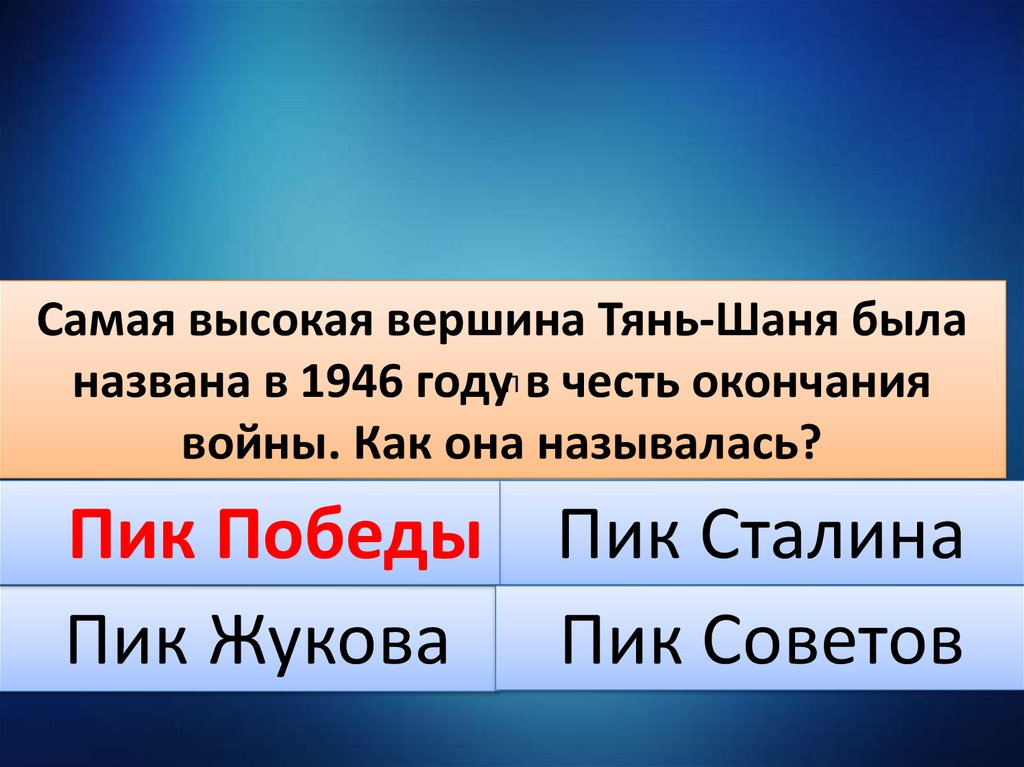 Самая высокая вершина Тянь-Шаня быланазвана в 1946 годуП в честь окончания