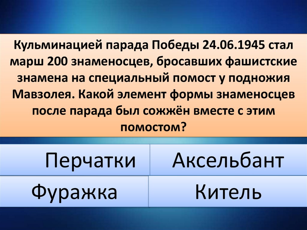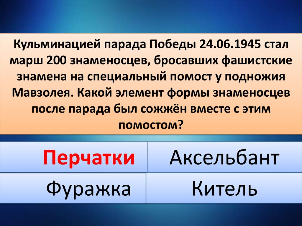 Кульминацией парада Победы 24.06.1945 сталмарш 200 знаменосцев, бросавших фашистские