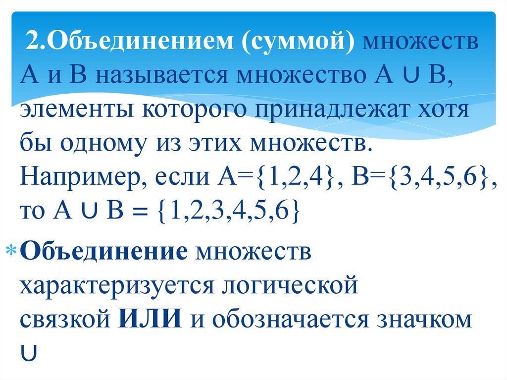 2.Объединением (суммой) множествА и В называется множество А ∪ В,