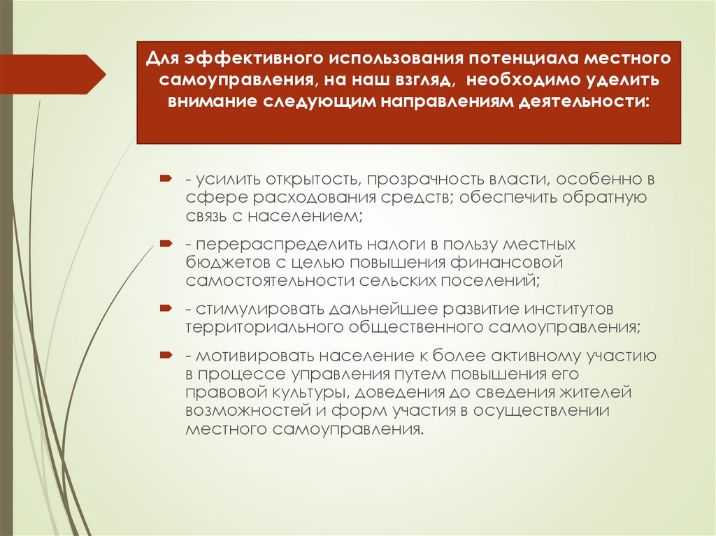 Для эффективного использования потенциала местногосамоуправления, на наш взгляд, необходимо уделить