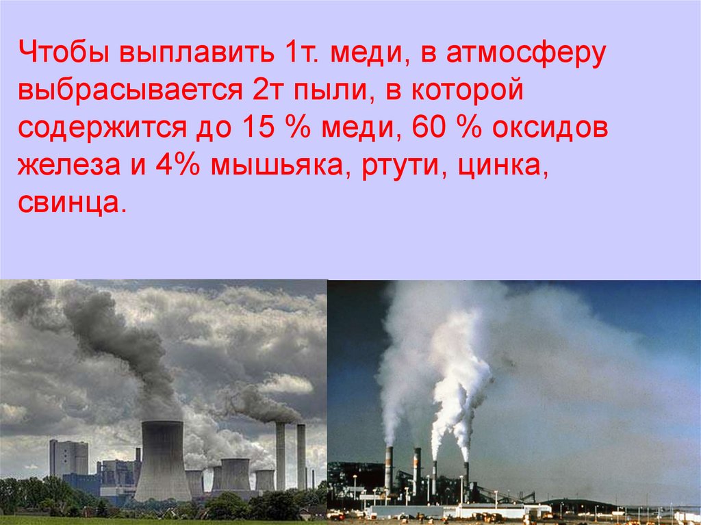 Чтобы выплавить 1т. меди, в атмосферувыбрасывается 2т пыли, в которой