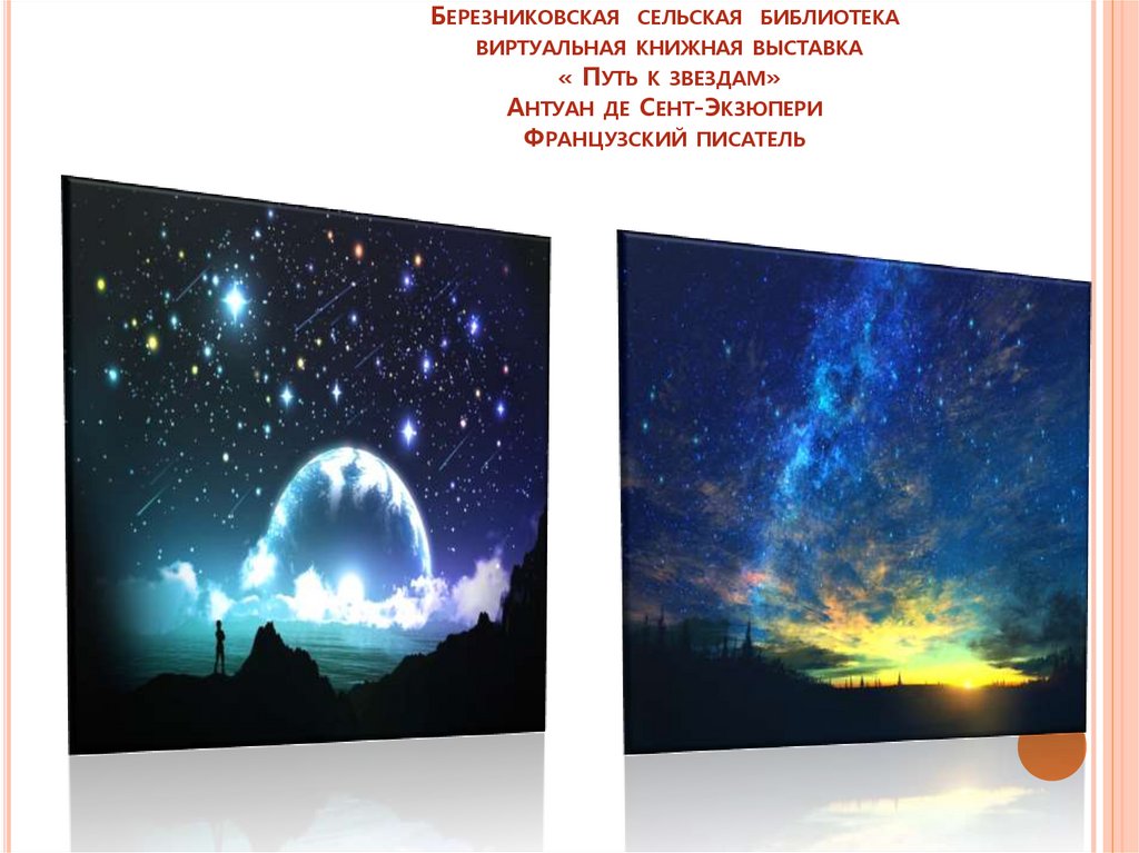 1. Березниковская сельская библиотека виртуальная книжная выставка « Путь к звездам» Антуан де Сент-Экзюпери Французский писатель