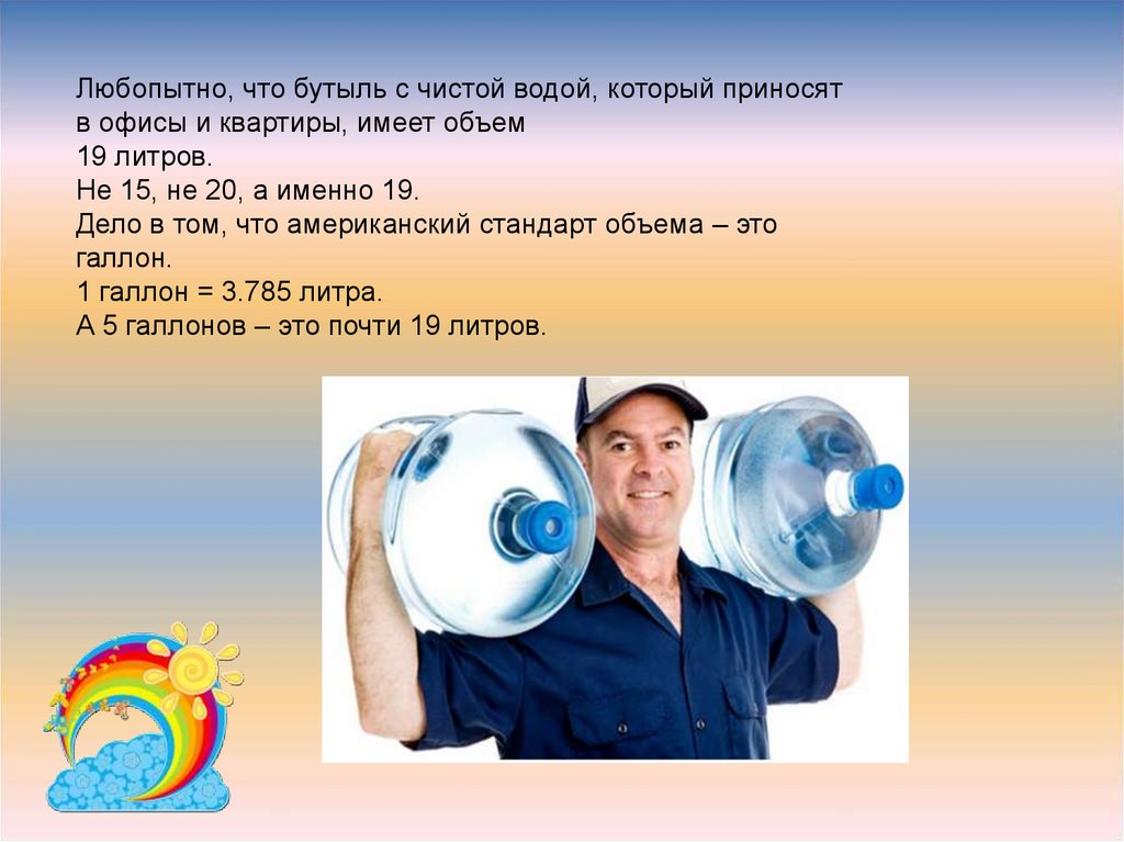 Любопытно, что бутыль с чистой водой, который приносятв офисы и квартиры, имеет объем