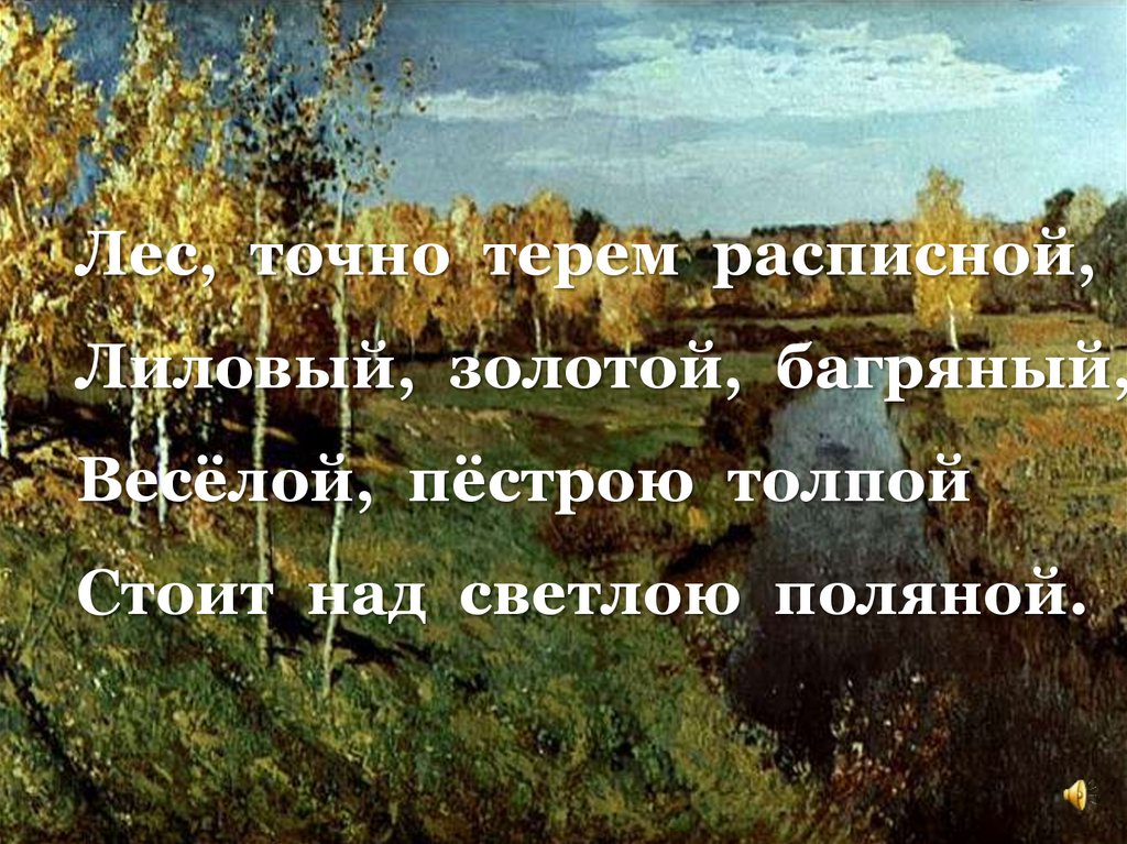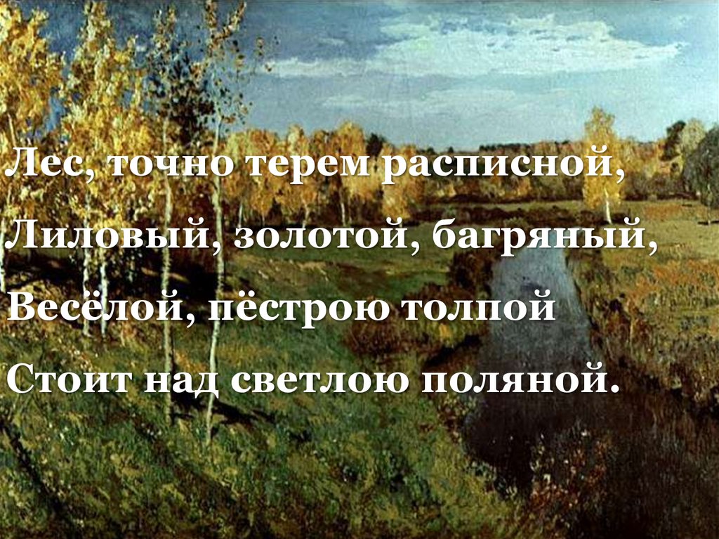 Лес, точно терем расписной,Лиловый, золотой, багряный,