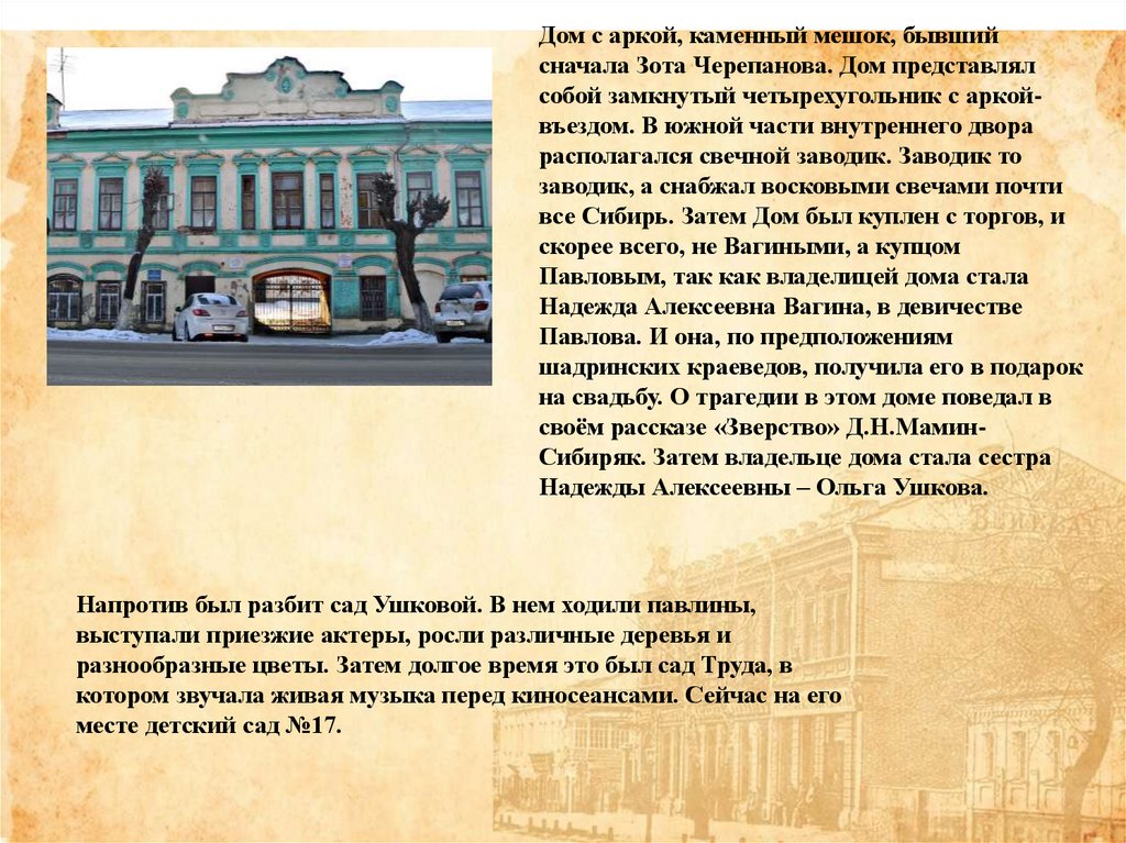 Дом с аркой, каменный мешок, бывшийсначала Зота Черепанова. Дом представлял