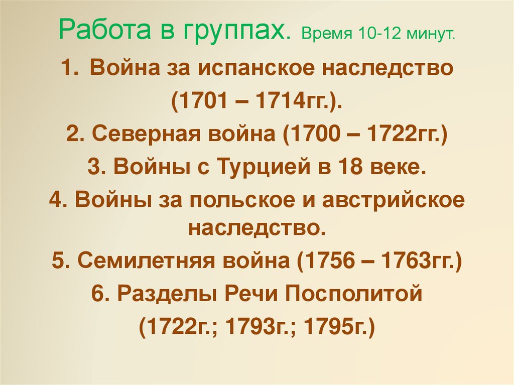 Работа в группах. Время 10-12 минут.1. Война за испанское наследство