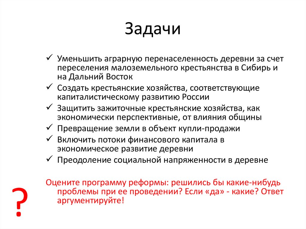 ЗадачиУменьшить аграрную перенаселенность деревни за счет
