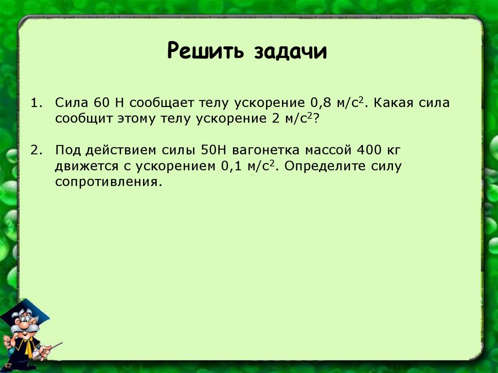 Решить задачи1. Сила 60 Н сообщает телу ускорение 0,8 м/с2. Какая сила