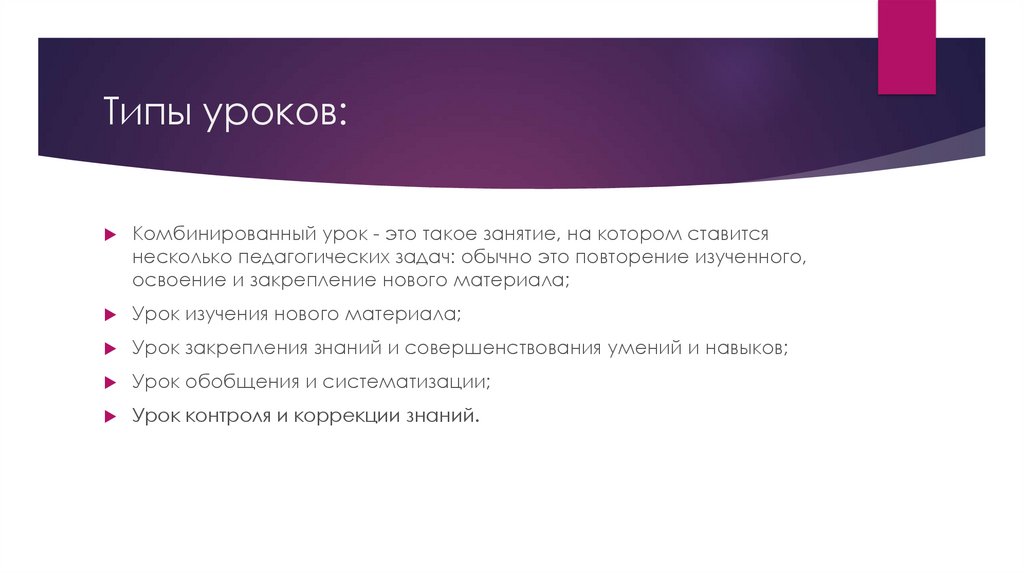 Типы уроков:Комбинированный урок - это такое занятие, на котором ставится