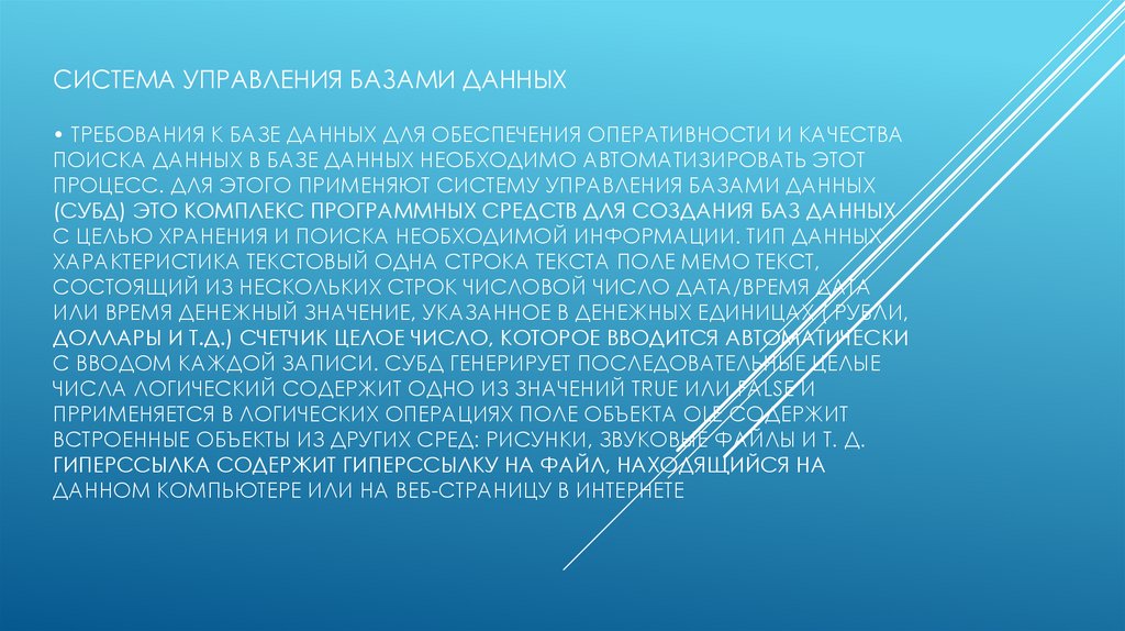 СИСТЕМА УПРАВЛЕНИЯ БАЗАМИ ДАННЫХ• ТРЕБОВАНИЯ К БАЗЕ ДАННЫХ ДЛЯ ОБЕСПЕЧЕНИЯ ОПЕРАТИВНОСТИ И КАЧЕСТВА