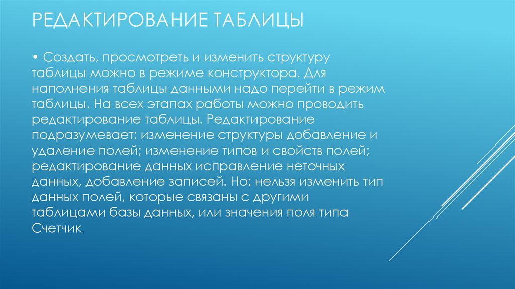 РЕДАКТИРОВАНИЕ ТАБЛИЦЫ• Создать, просмотреть и изменить структуру