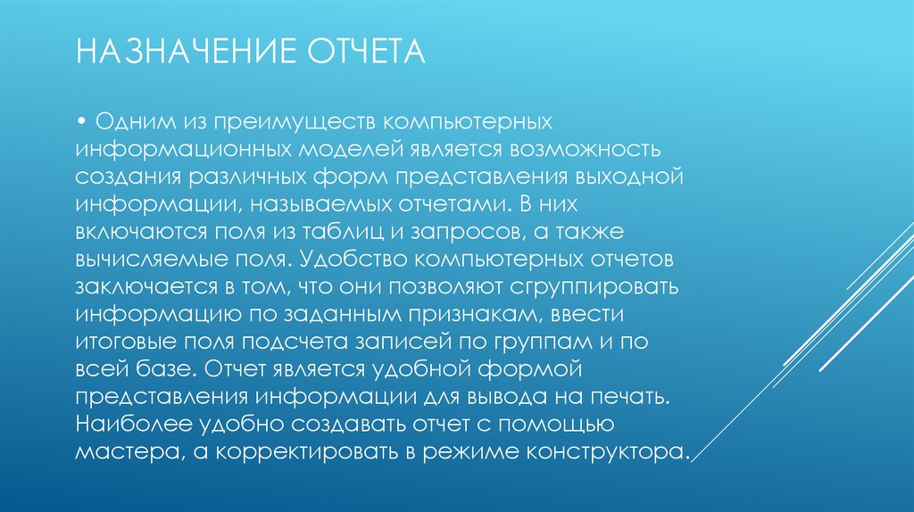 НАЗНАЧЕНИЕ ОТЧЕТА• Одним из преимуществ компьютерных