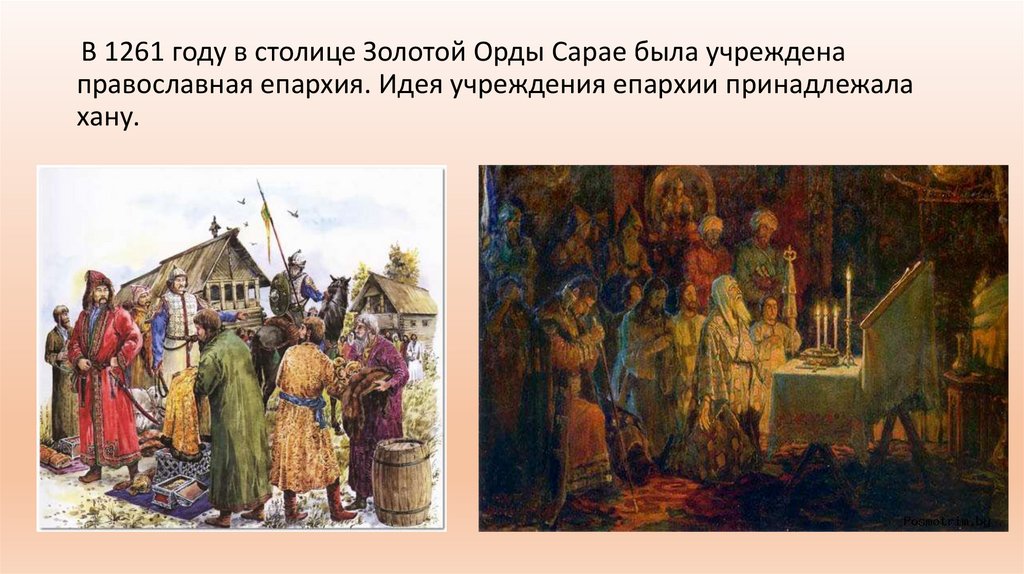 В 1261 году в столице Золотой Орды Сарае была учрежденаправославная епархия. Идея учреждения епархии принадлежала