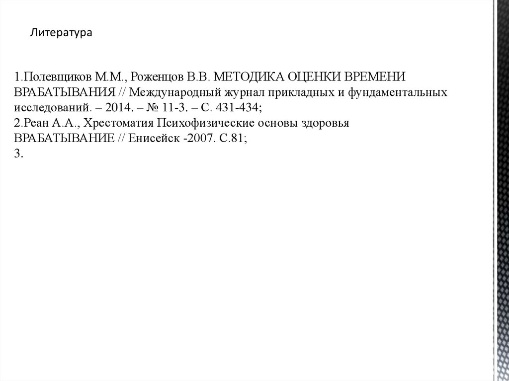 Литература1.Полевщиков М.М., Роженцов В.В. МЕТОДИКА ОЦЕНКИ ВРЕМЕНИ