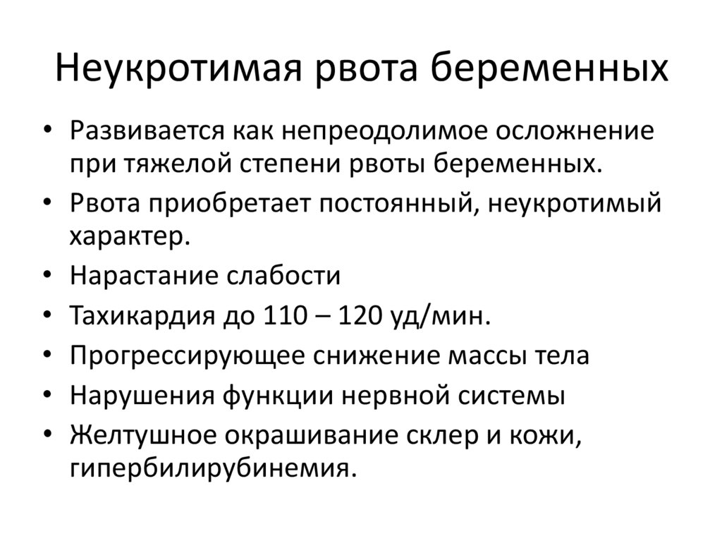 Неукротимая рвота беременных• Развивается как непреодолимое осложнение