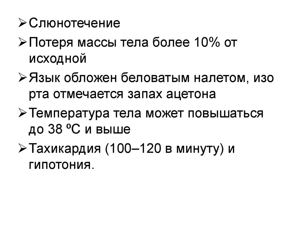 СлюнотечениеПотеря массы тела более 10% от