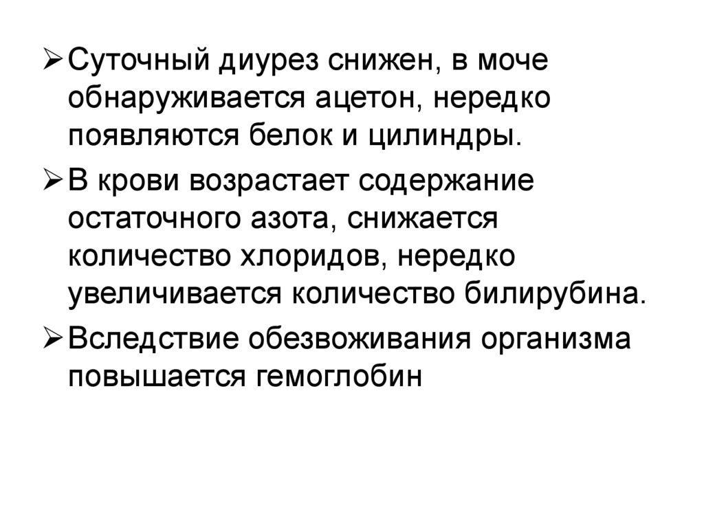 Суточный диурез снижен, в мочеобнаруживается ацетон, нередко