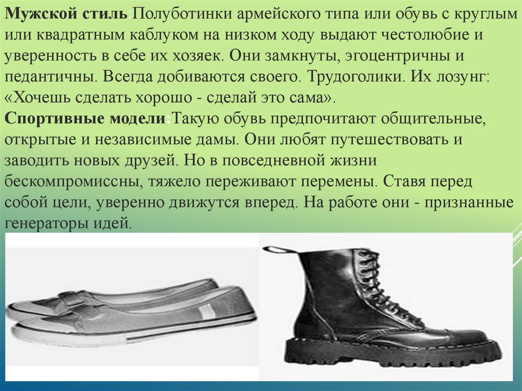 Мужской стиль:Полуботинки армейского типа или обувь с круглымили квадратным каблуком на низком ходу выдают честолюбие и