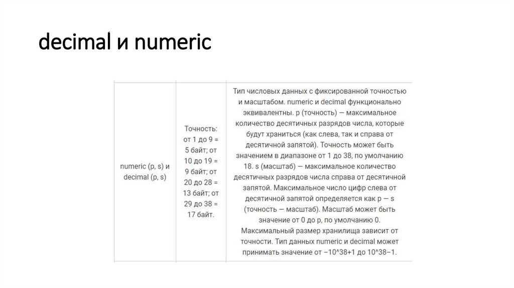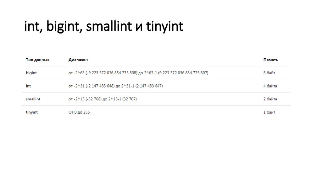 Типы данных• Точные числа (bigint, numeric, bit, smallint, decimal, smallmoney, int,