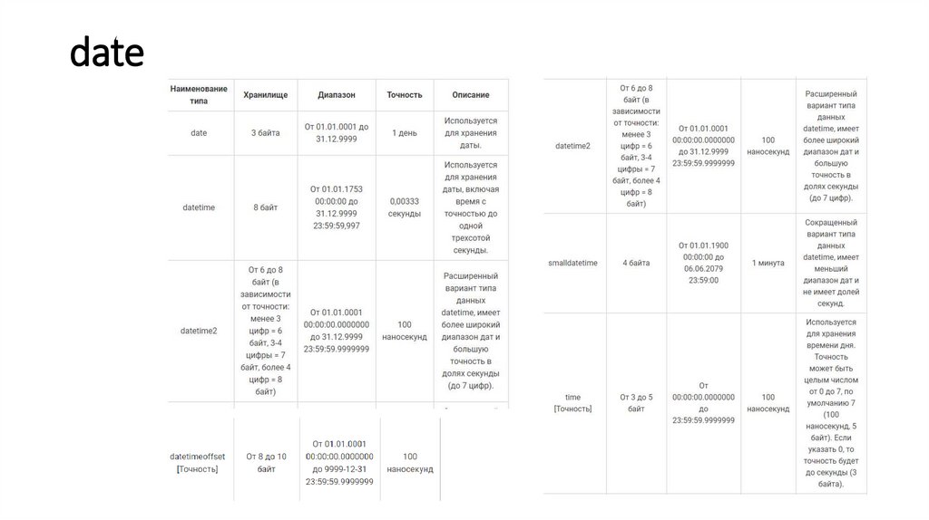 • Дата и время (date, datetimeoffset, datetime2, smalldatetime, datetime,