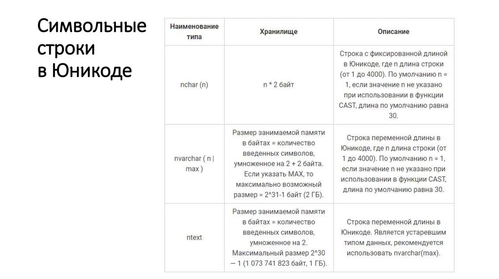 • Символьные строки в Юникоде (nchar, nvarchar, ntext)