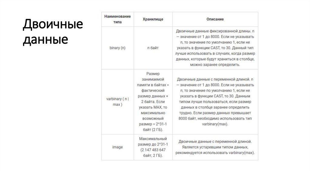 • Прочие типы данных (cursor, rowversion, hierarchyid, uniqueidentifier,