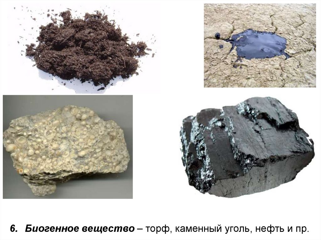 6. Биогенное вещество – торф, каменный уголь, нефть и пр.12.