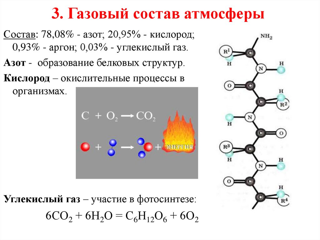 3. Газовый состав атмосферыСостав: 78,08% - азот; 20,95% - кислород;