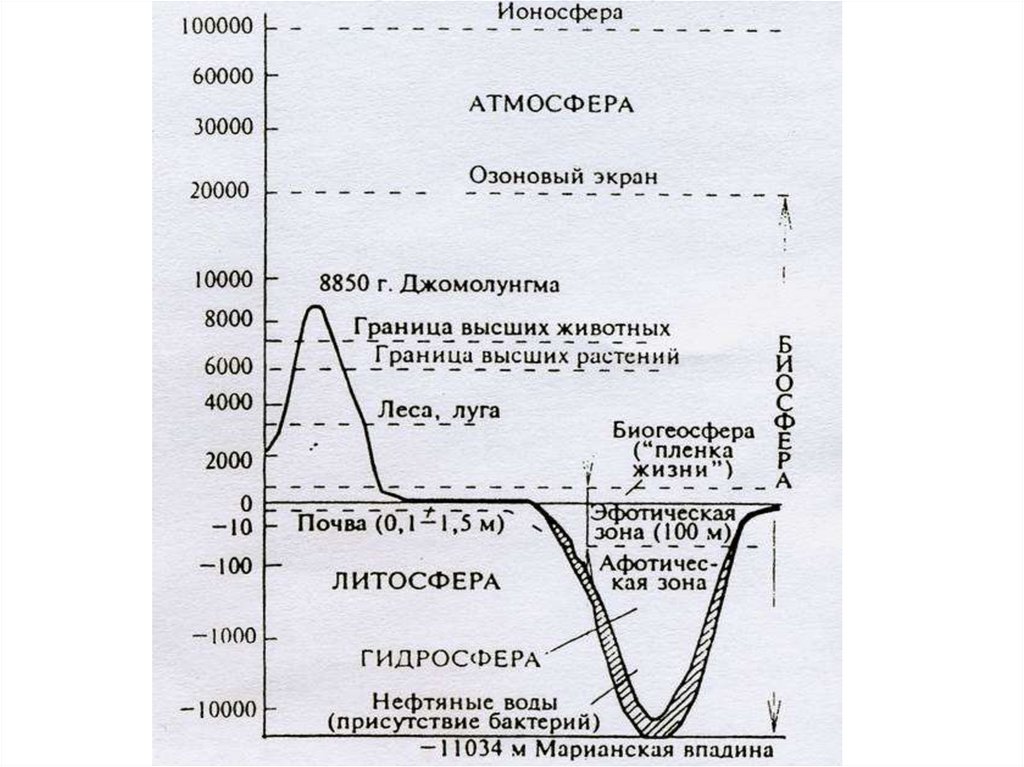 Протяженность биосферы по вертикали и соотношениеповерхностей, занятых основными структурными единицами