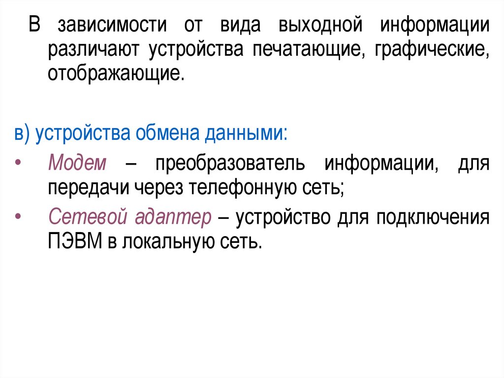 В зависимости от вида выходной информацииразличают устройства печатающие, графические,
