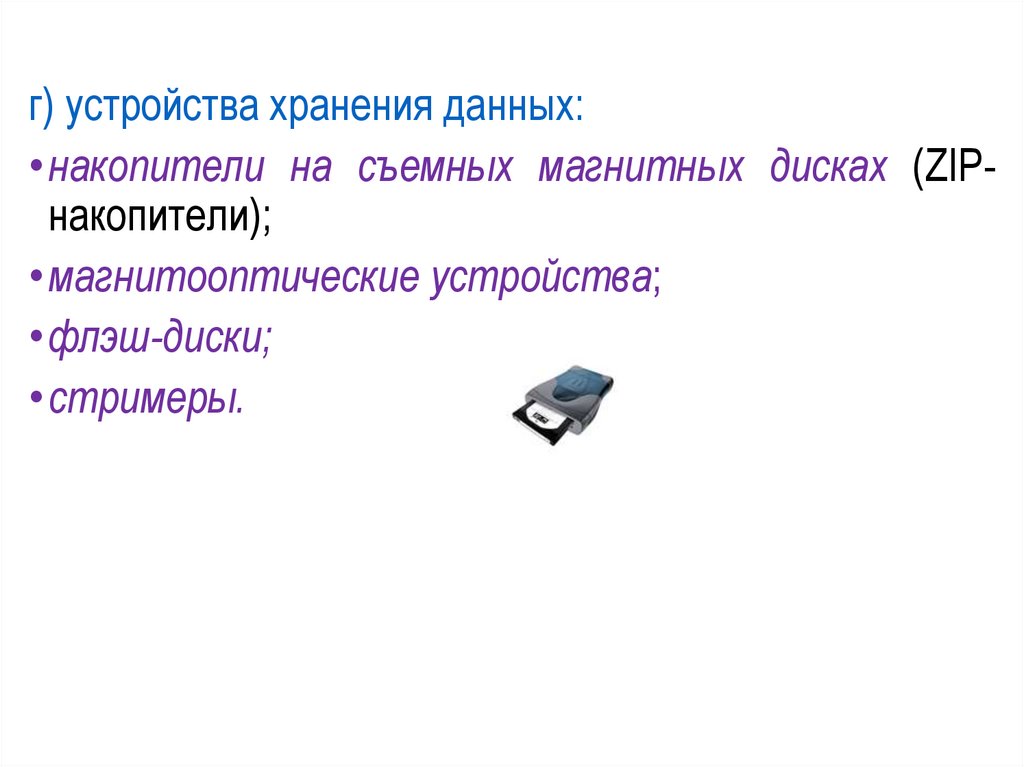 г) устройства хранения данных:•накопители на съемных магнитных дисках (ZIPнакопители);