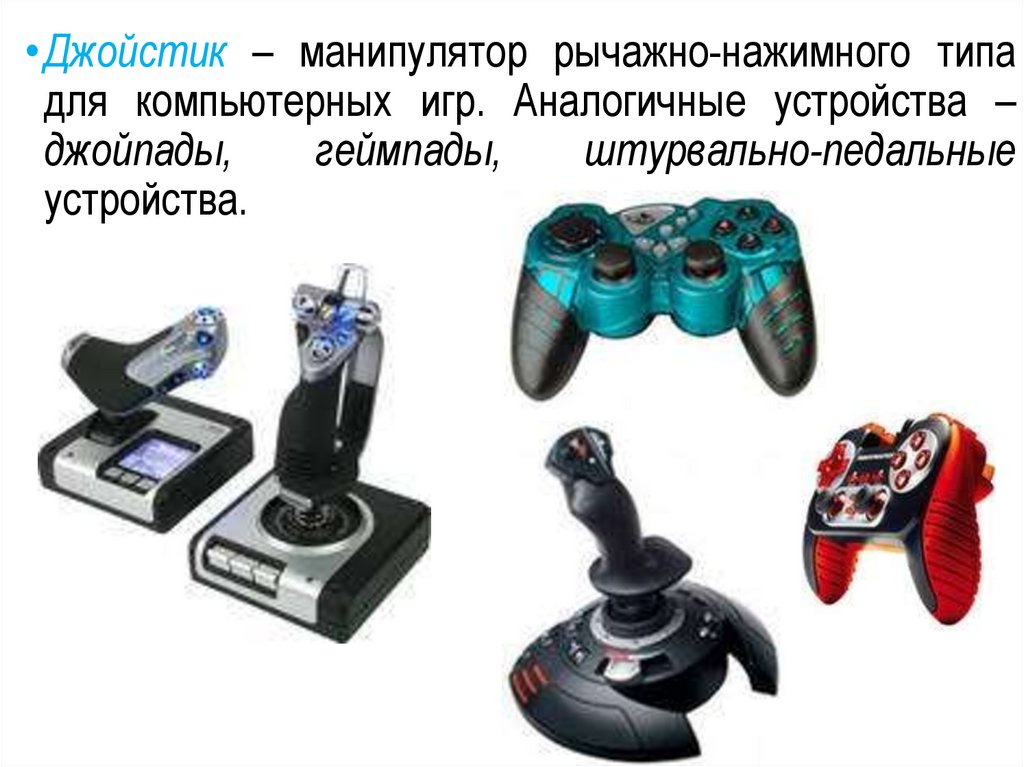•Джойстик – манипулятор рычажно-нажимного типадля компьютерных игр. Аналогичные устройства –