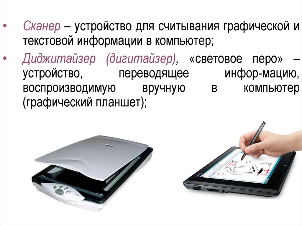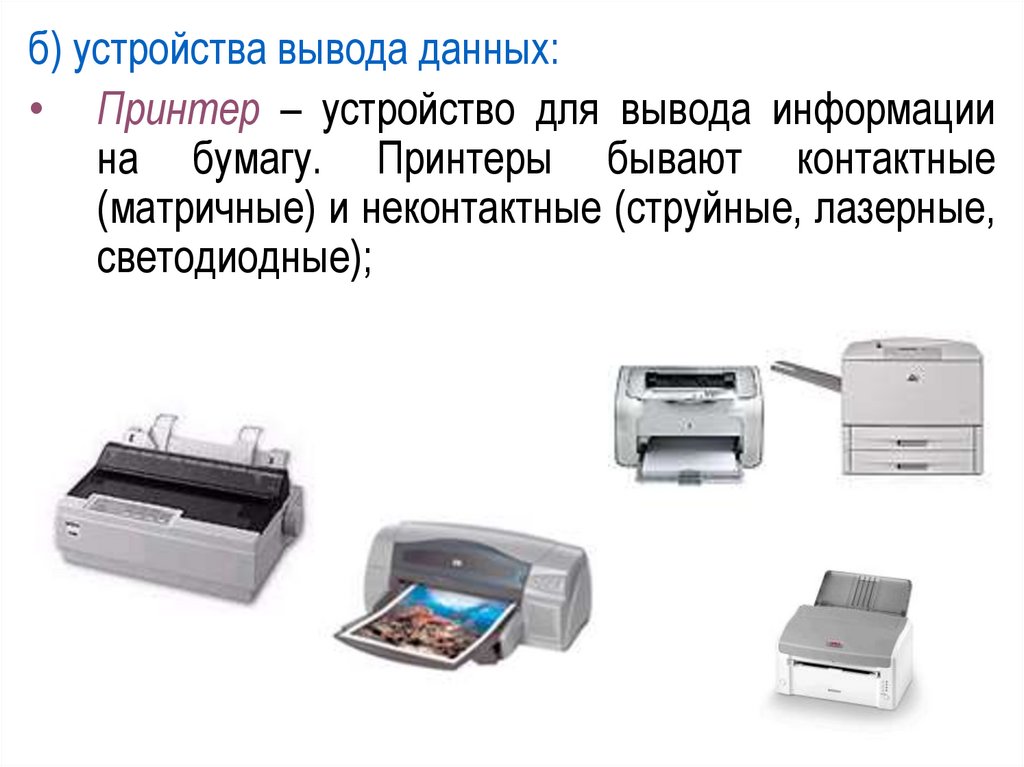 б) устройства вывода данных:• Принтер – устройство для вывода информации